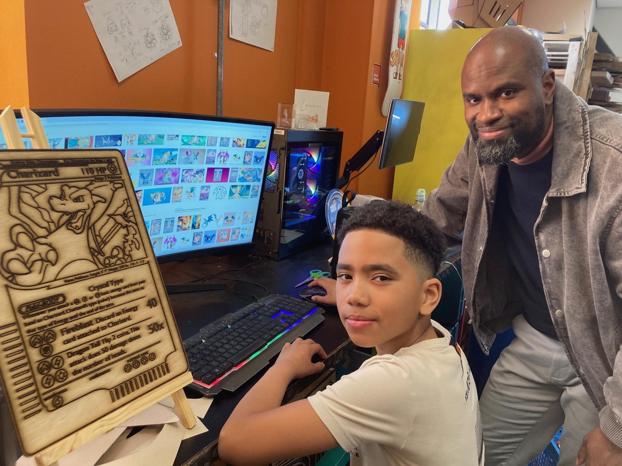 Jafar uit groep 8 van de Jozef Sartoschool zit geconcentreerd naar het computerscherm te kijken met veel verschillende afbeeldingen van pokémonkaarten. Hij heeft van triplex een grote pokémonkaart gemaakt en doet nu inspiratie op om zijn eigen pokémonfiguur te ontwerpen. ‘Ik vind het helemaal geweldig’, zegt Jafar met stralende ogen. ‘Mijn thema is vuur en lava. Het is supercool om veel verschillende mogelijkheden te zien en dan naar eigen inzicht iets te maken.’
