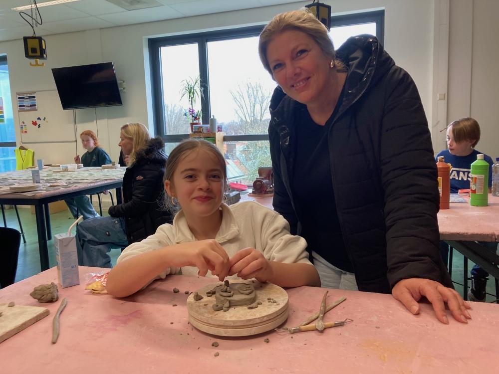 Bij keramiek maken de scholieren allemaal een tegeltje van klei, dat ze zelf decoreren. ‘Met al die tegeltjes maken we straks een groter kunstwerk’, vertelt kunstdocent Myrthe. Charlina van basisschool De Witte Vlinder is heel precies bezig, terwijl haar moeder toekijkt. ‘Ik maak een ontbijt op het tegeltje. Dat heb ik zelf bedacht. Straks gaan we de tegel verven’, vertelt Charlina. ‘Ze houdt van knutselen en van werken met klei. Dus deze lessen zijn echt iets voor haar’, zegt haar moeder. ‘Ze kan ook goed tekenen, toen ze klein was al.’ Charlina lacht en zegt: ‘Later wil ik architect worden.’