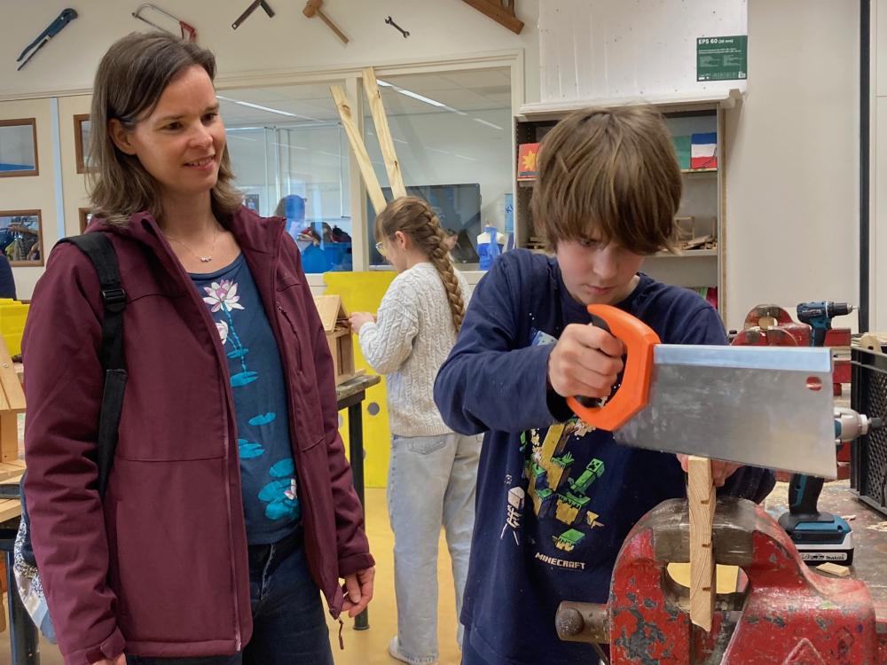 ‘De kruisbestuiving tussen de kinderen van verschillende scholen is ook goed om te zien’, constateert Vera. Ze vertelt dat haar zoon autisme heeft en het soms lastig vindt contact te maken met anderen. ‘Dit is een leuke leeromgeving, waarin het contact maken met andere kinderen bijna vanzelf gaat, bijvoorbeeld omdat ze elkaar helpen. Jasper heeft hier al andere kinderen leren kennen.’ Jasper is inmiddels aan het zagen, wat de nodige inspanning kost. ‘Dit is best zwaar’, zegt hij. ‘Maar het is wel eens wat anders dan rekenen, spelling en taal.’
